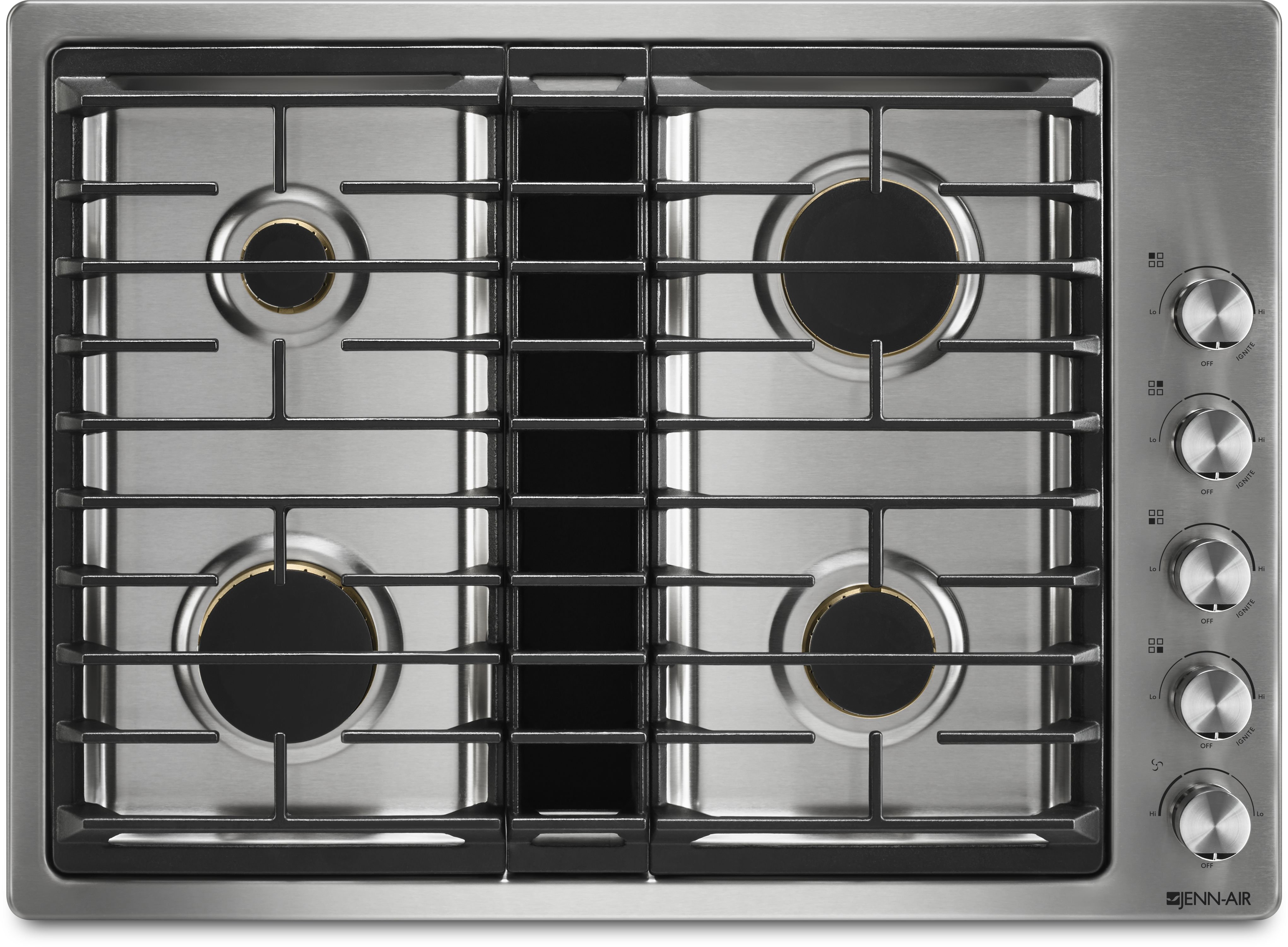 This Jenn-Air® luxury gas downdraft cooktop features four sealed burners, including a 17,000 BTU ultra-high output burner. Its impressive JX3™ downdraft ventilation system quickly and efficiently clears the air without a hood.