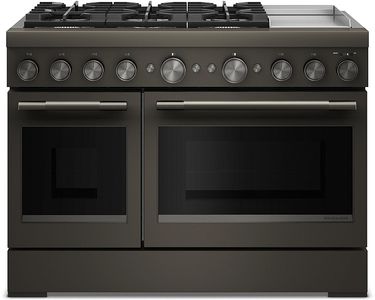 Satisfy your craving to create with a 48-inch KitchenAid® Commercial-Style Range with Chrome Electric Griddle. This dual fuel range combines an electric double oven with a 6-burner gas cooktop. Two 20,000 BTU Ultra Power™ Dual-Flame Burners offer power and precision to successfully sear, simmer, stir-fry and sauté. Even-Heat™ True Convection gives consistent baking and roasting, plus air fry mode that yields crispy, golden results.Read More