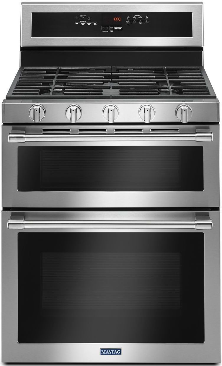 Cook the whole meal at once with two separate ovens and a spacious total capacity of 6.0 cu. ft. in this Maytag® double oven gas range.