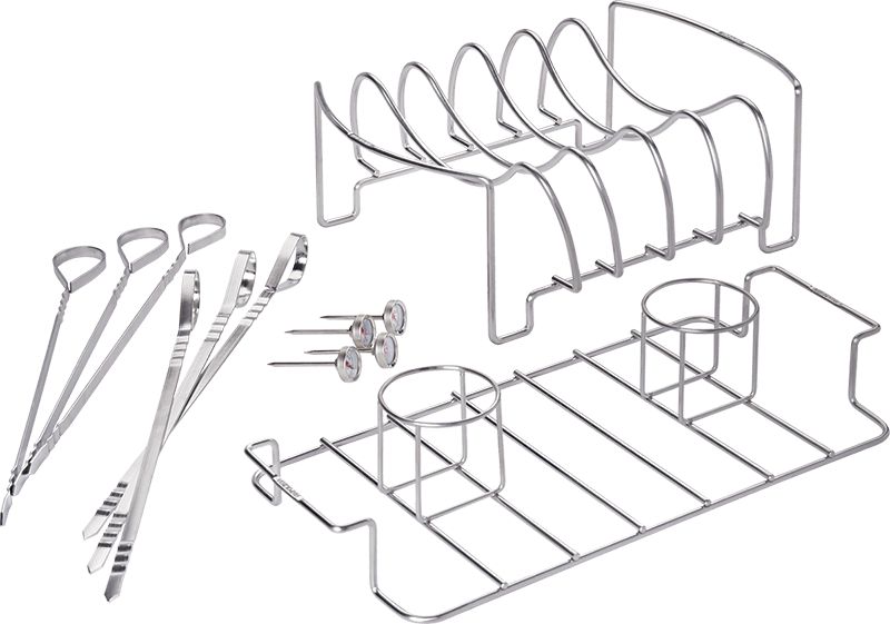 Everything you need to make your own delicious, meaty meals is included in Napoleon's Meat Lover's Starter Kit. The Stainless Steel Rib Rack is the perfect way to grill up multiple racks of ribs, or roast some delicious beef. Double your fun with the Stainless Steel Double Beer Can Chicken Roaster. This roaster has two cradles for holding your favourite bubbly beverage in place, while supporting up to two chickens in the perfect position for crispy skin on every side. Build your own kebabs with Six Stainless Steel Skewers. Fill with layers of your favourite marinated meats and veggies for a fun and custom meal that everyone will love. The four, included, Stainless Steel Button Thermometers are perfect for ensuring everyone gets a steak grilled to perfection, that the roast is ready, and the chicken cooked. If you're a fan of big and beefy barbecues, then our Meat Lover's Starter Kit is ideal for the perfect backyard party!Read More