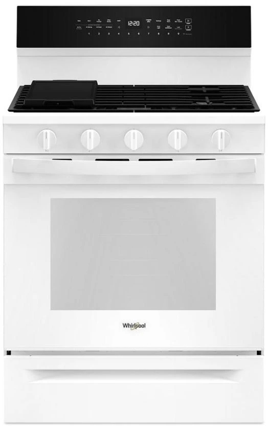 Whirlpool® 30" White Freestanding Gas Range features SpeedHeat™ Burner, Air Cooking Technology, EZ-2-Lift™ Hinged Cast-Iron Grates, No Preheat Air Fry, Steam Clean, No Preheat Mode, Griddle Zone, and Keep Warm Setting.Read More