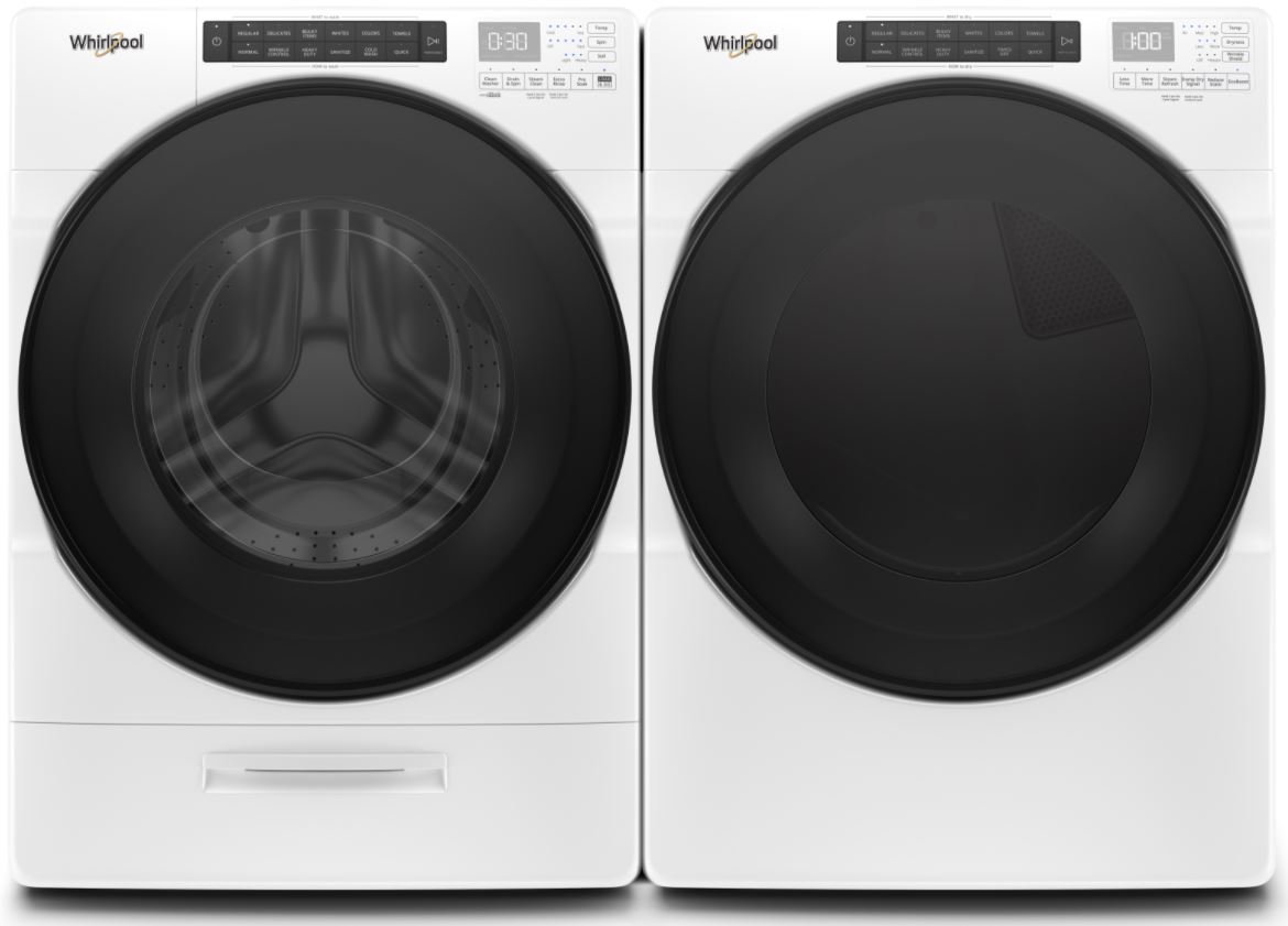 Whirlpool® White Front Load Laundry Pair with a 5.2 cu. ft. capacity washer and a 7.4 cu. ft. capacity electric dryer.Read More